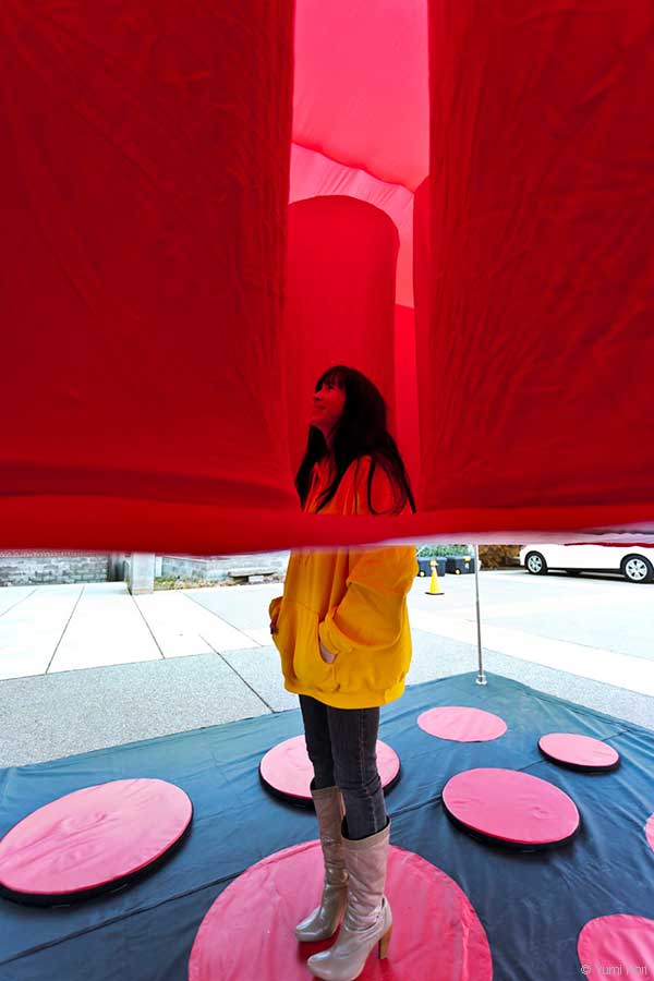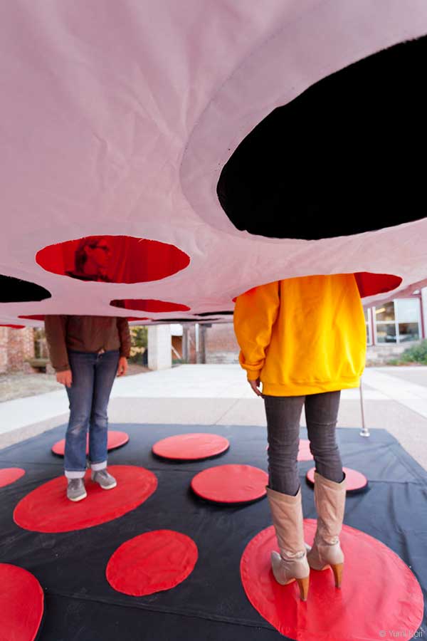 This is an portable architectural device in which people can discover another space. It has been traveling in the public space of the city of Pittsburg such as public schools, town plazas or parks. Each halls are different space, some are dark cylinder space ,some are halls to see the interior of the cube, some are big and some are small…..