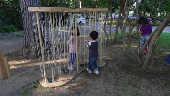 公園に一歩足を踏み入れると、風の音に混じって方々から不思議な音が聞こえてくる。耳をすますとそれは木の間につり下げられた竹のオブジェから聞こえてくる。ガムランの音色のようで、聞いているだけで安らぎを感じる。作家は、松本秋則さんという方らしい。こういうローテクで気負っていない作品は、見ているだけで幸せになる。
